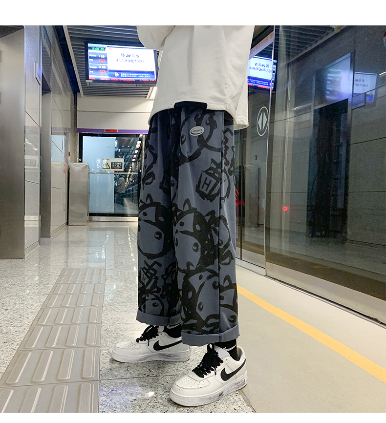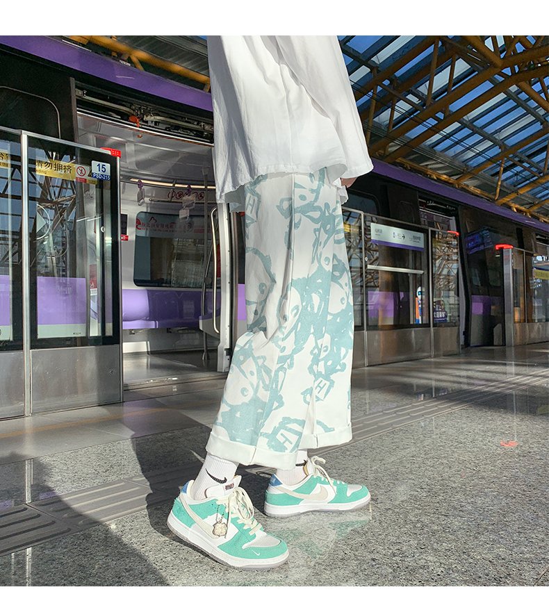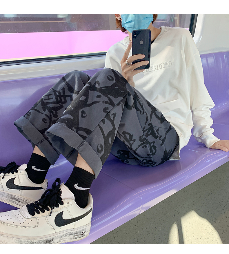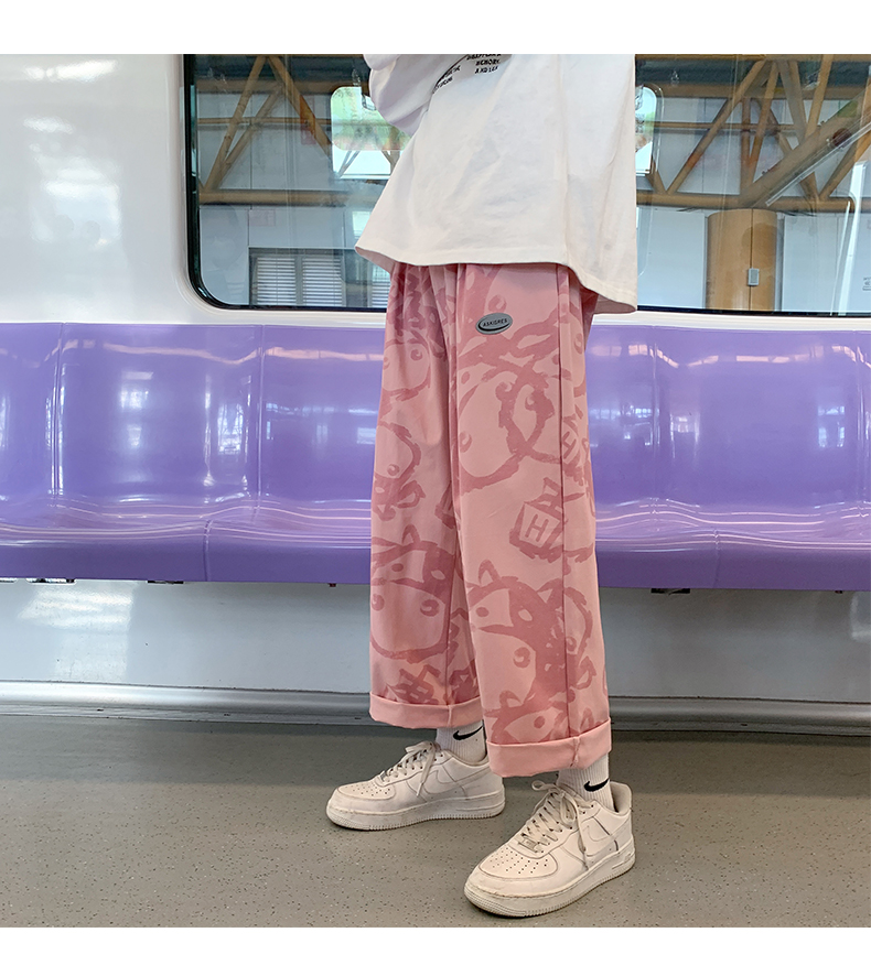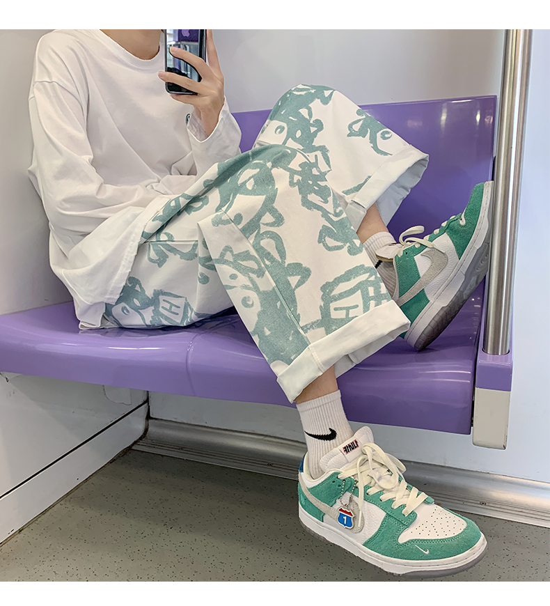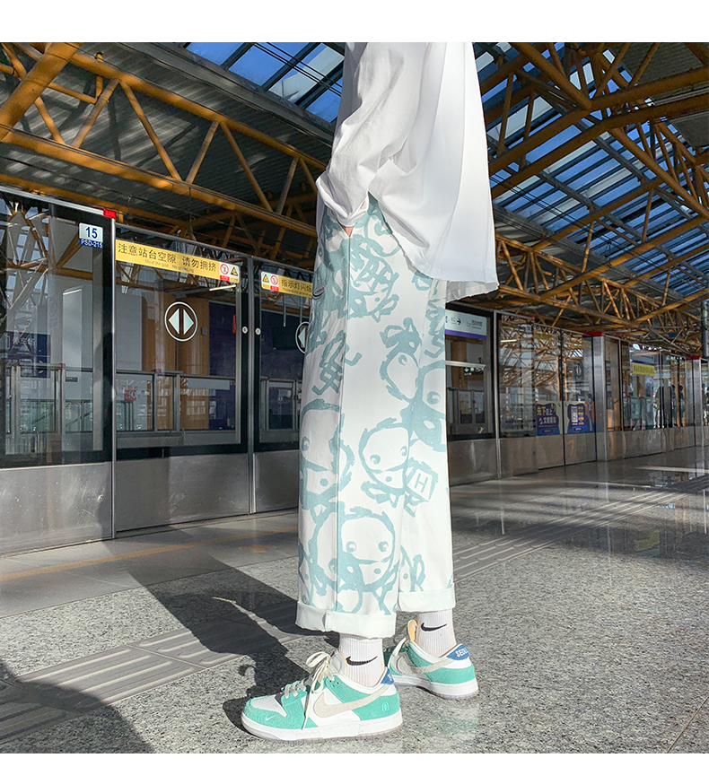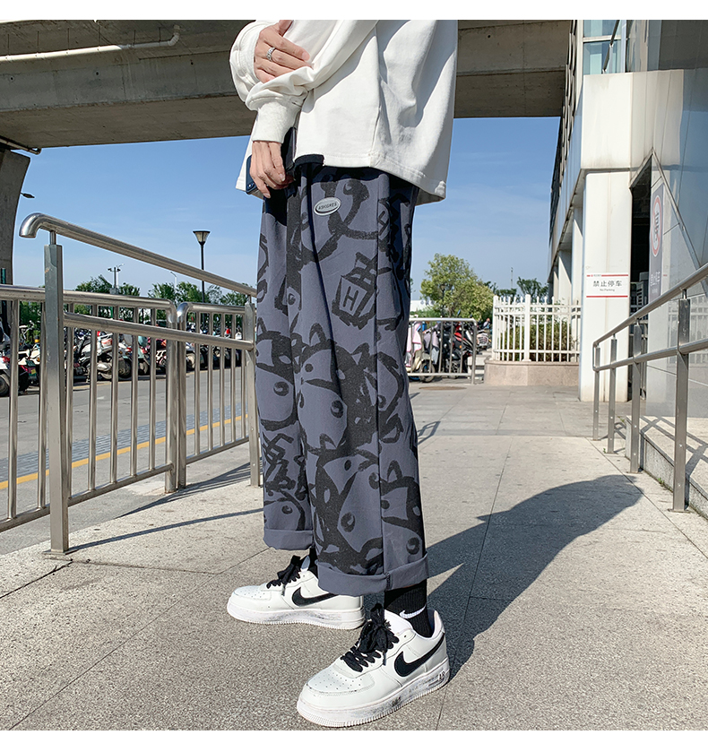 涂鸦裤子男士薄款ins夏季宽松直筒港风潮流休闲春秋大码胖九分裤