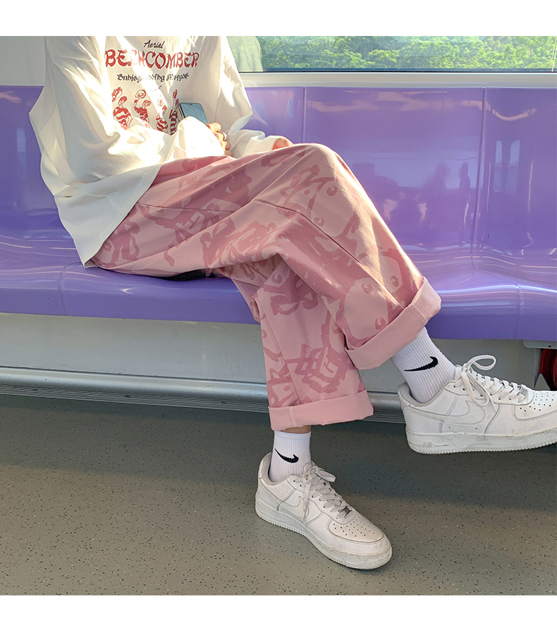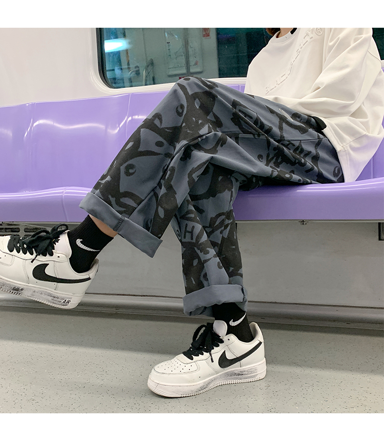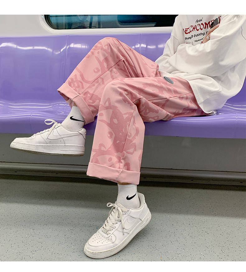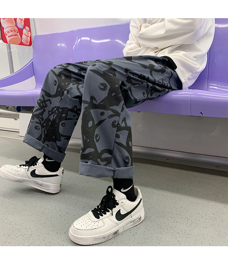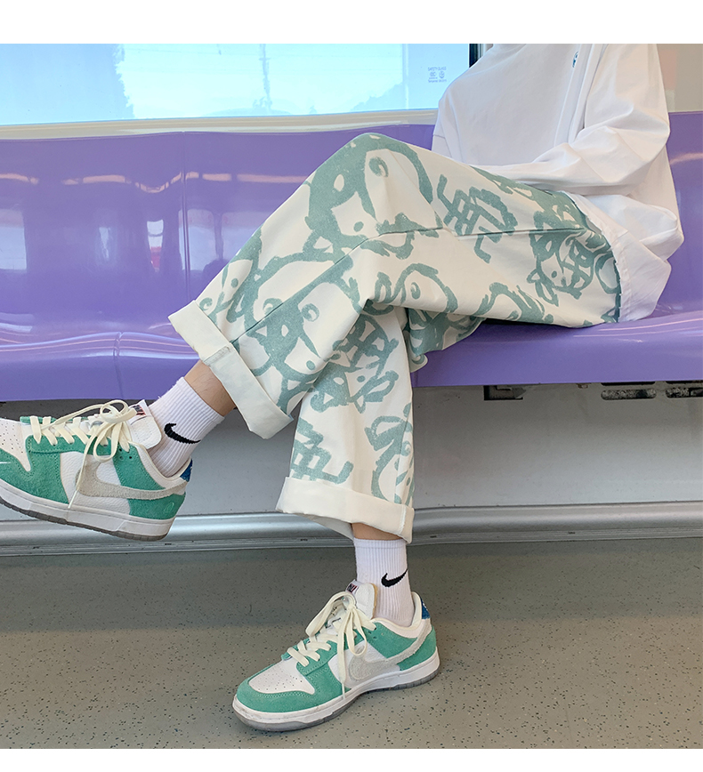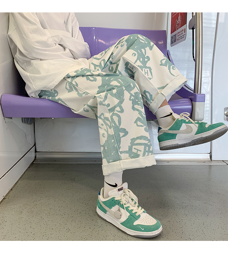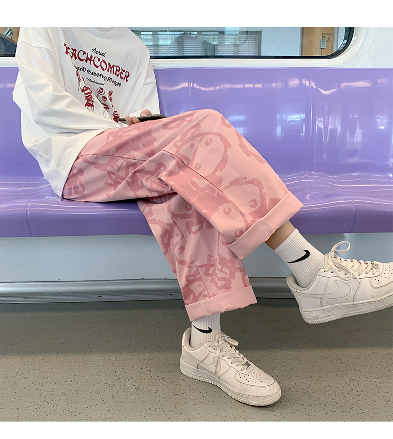 涂鸦裤子男士薄款ins夏季宽松直筒港风潮流休闲春秋大码胖九分裤