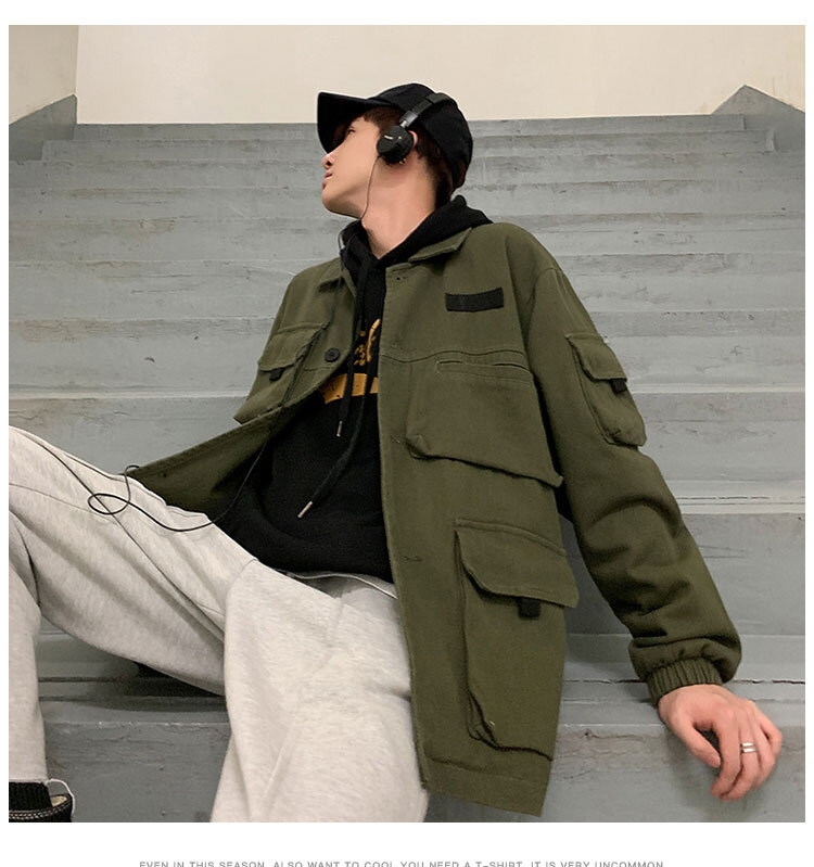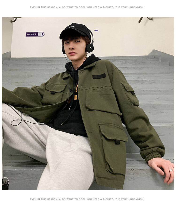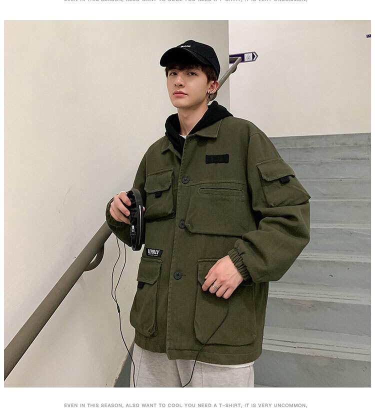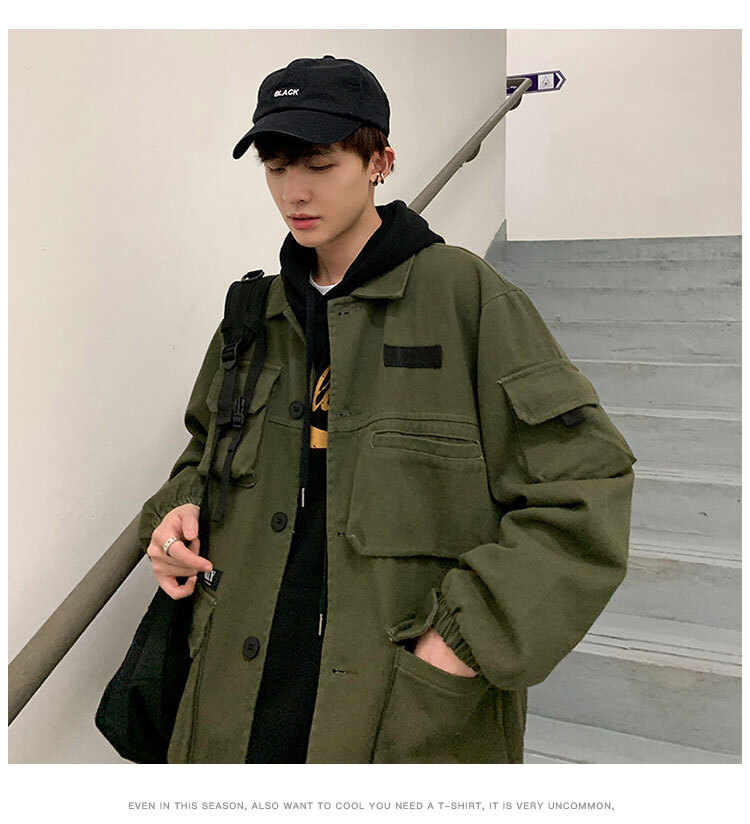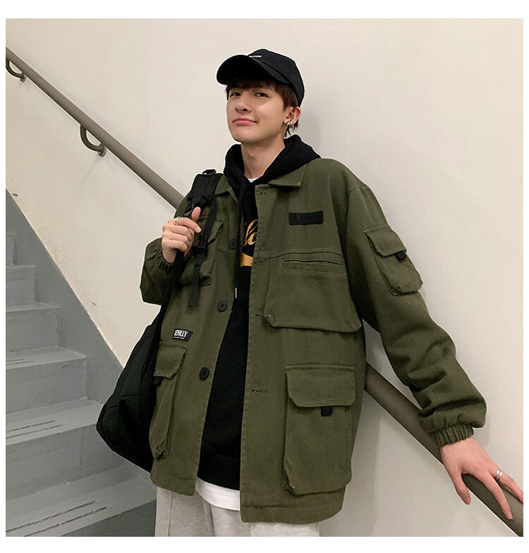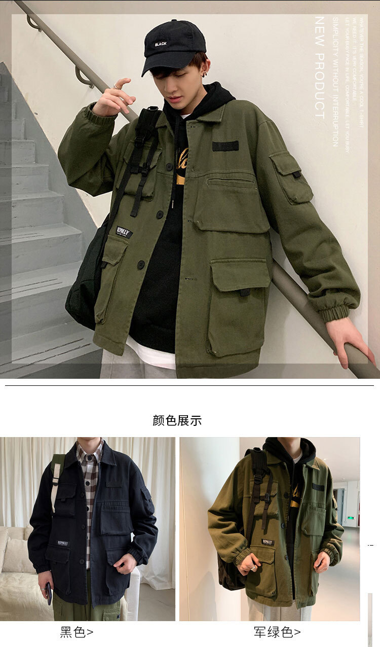 军绿色机能风工装外套男士ins潮牌春秋季大码宽松飞行员夹克高街
