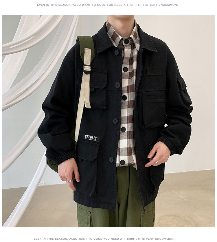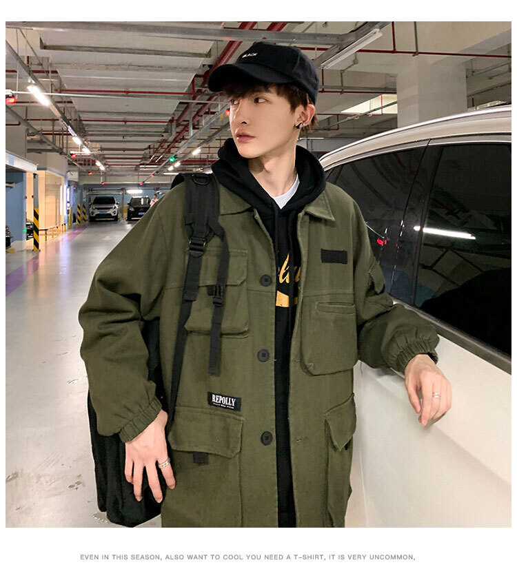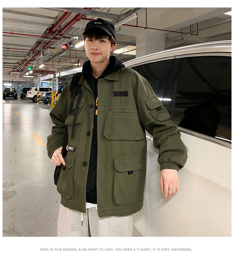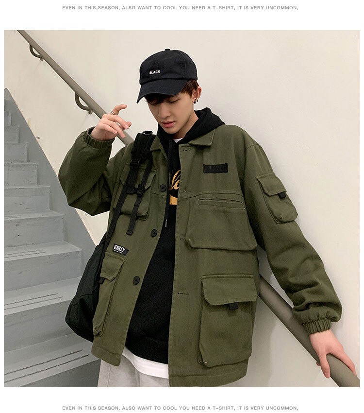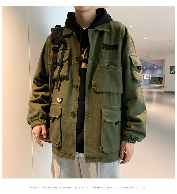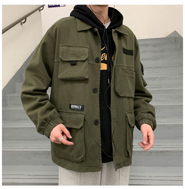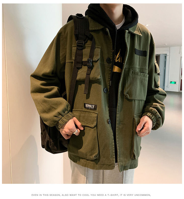 军绿色机能风工装外套男士ins潮牌春秋季大码宽松飞行员夹克高街
