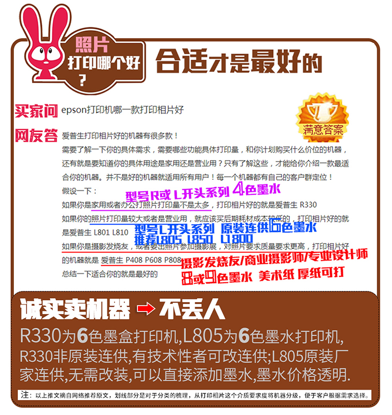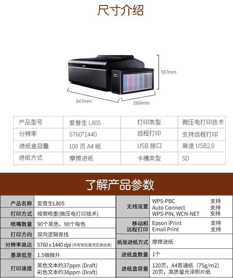 EPSON爱普生L805/r330/L1300/影楼专业彩色照片打印机无线墨仓式6色原装连供办公商用图文设计L1800/WF-4838