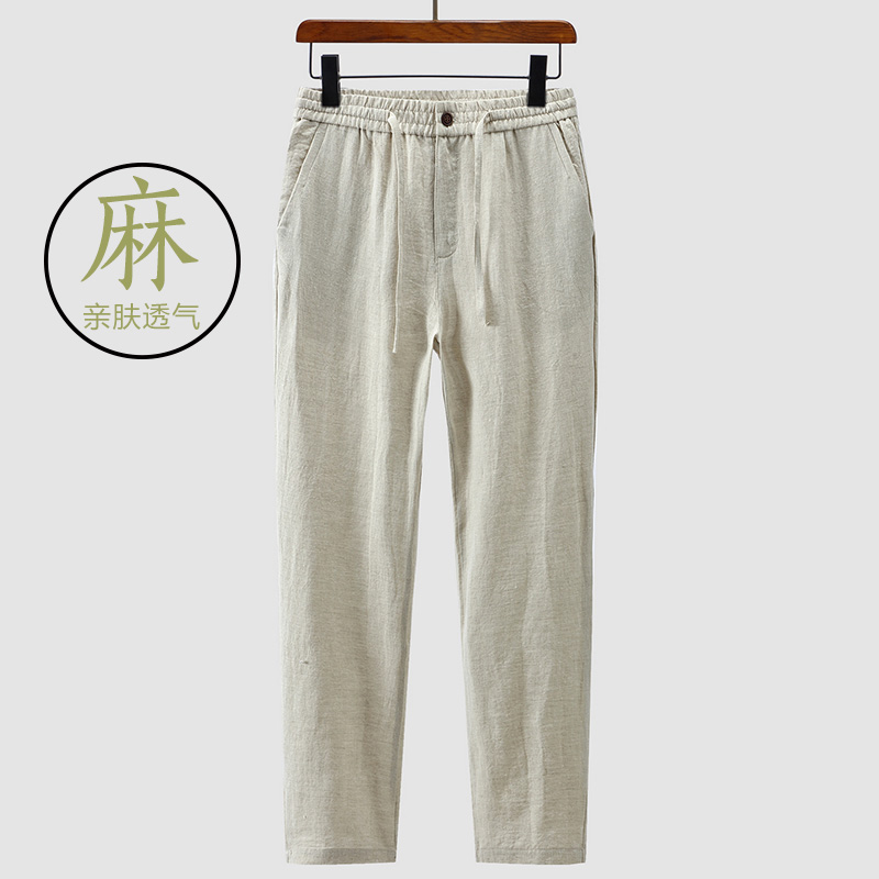 男士亚麻裤子夏款薄款休闲裤男长裤宽松直筒中老年爸爸裤子九分裤
