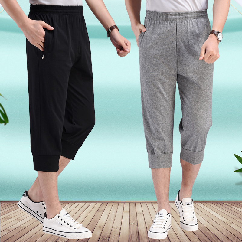 夏季薄款收口七分裤男士宽松纯棉运动短裤青中年松紧休闲7分中裤